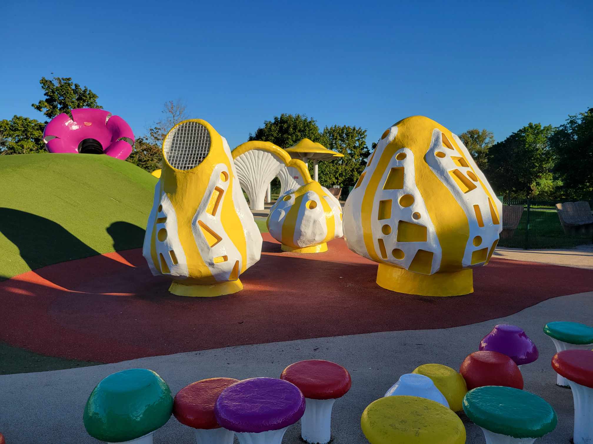 Une aire de plein air basée sur le concept du champignon, donc bcq de couleurs, de formes variées, le tout pour s'amuser à loisirs..., un vrai bonheur pour les petits, les moyens et les grands, bcq de vent lors de notre visite mais c'était trop fun
