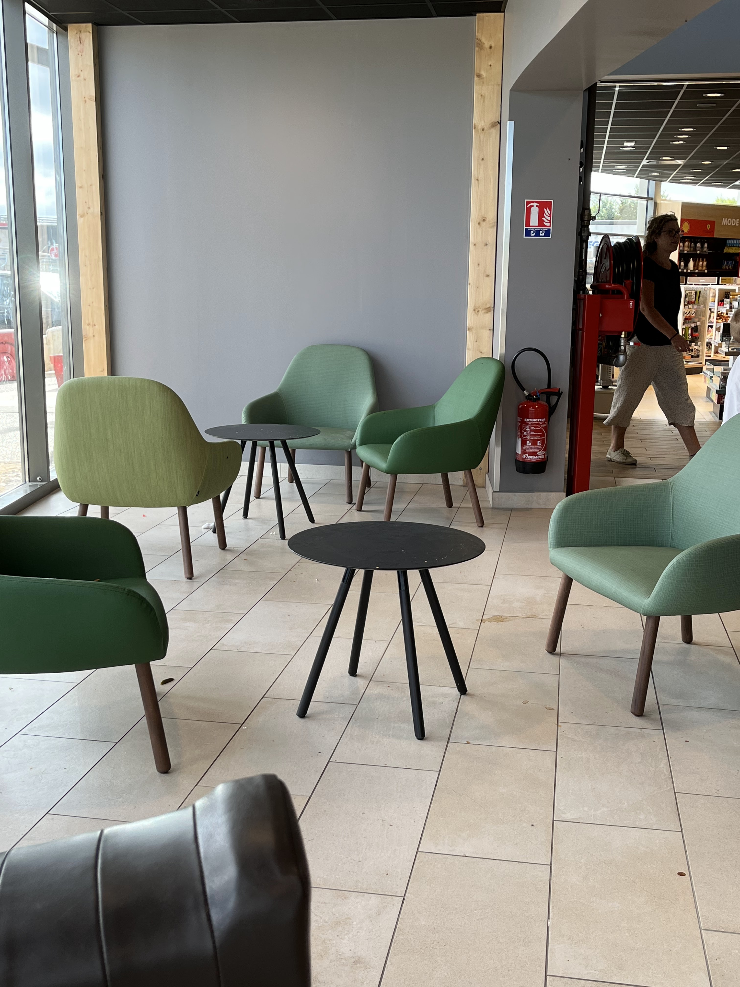 Aire d'autoroute très propre et agréable.Peu fréquentée. Cafétéria. Coin salon pour déguster tranquillement.accessible aux personnes en fauteuil.prises pour ordinateurs.